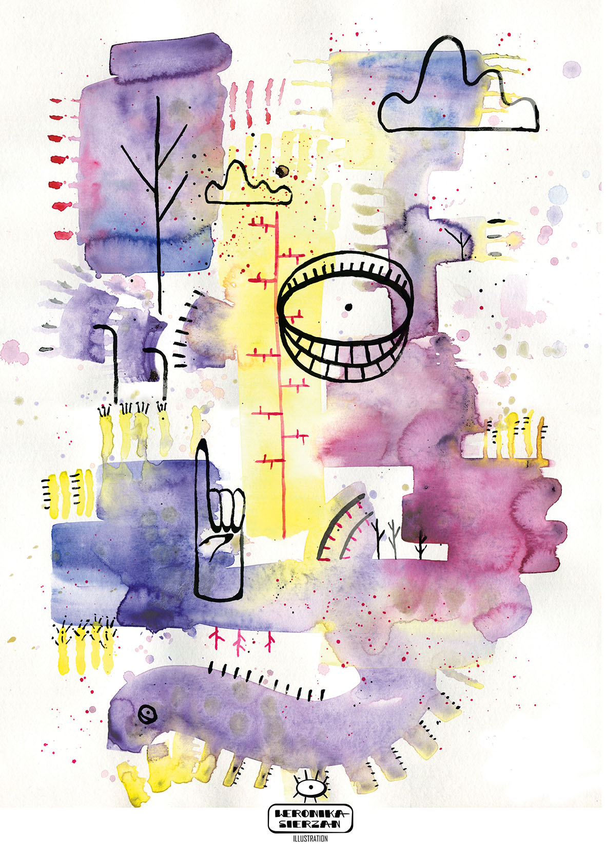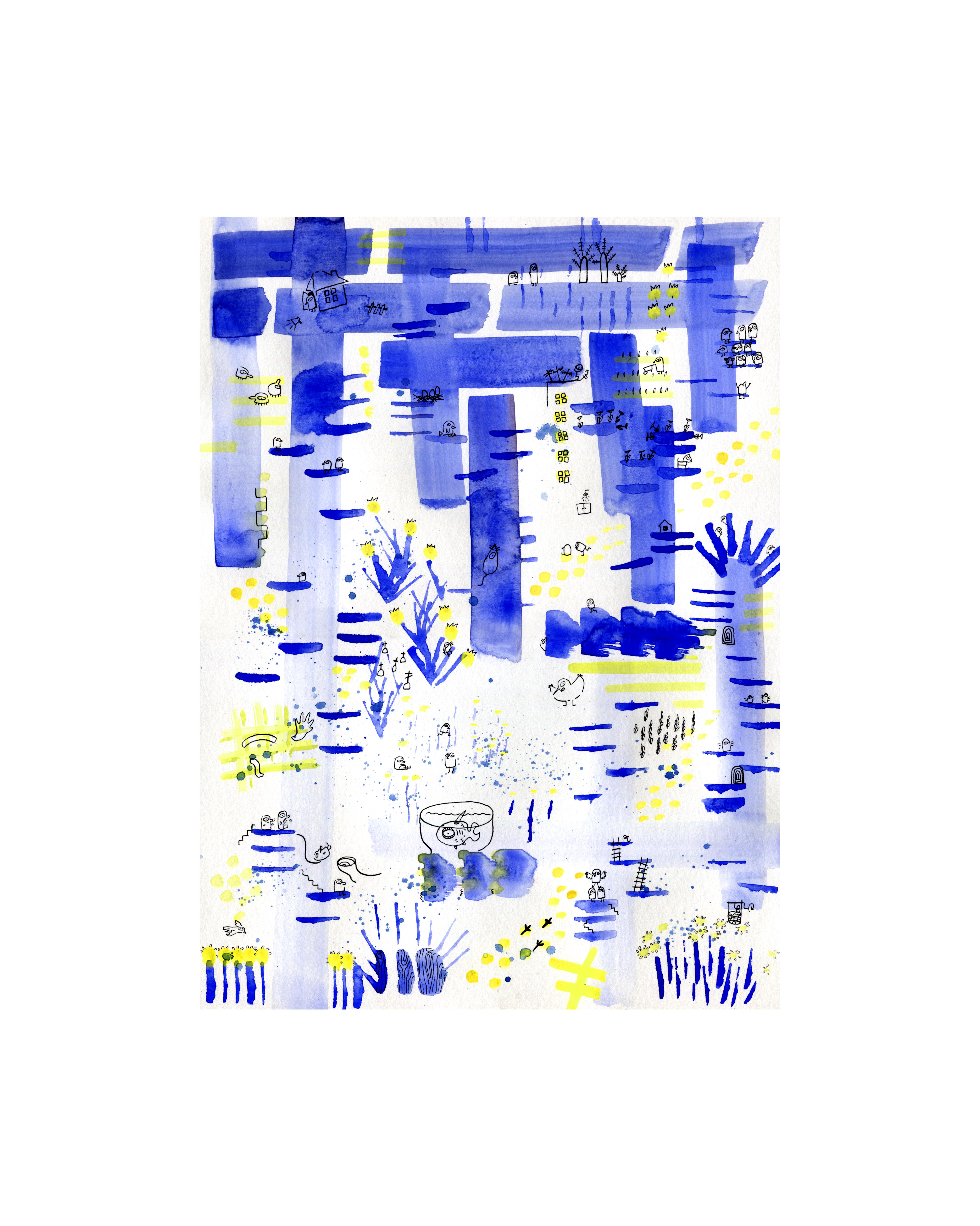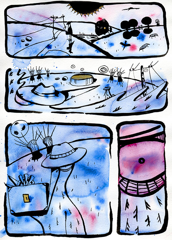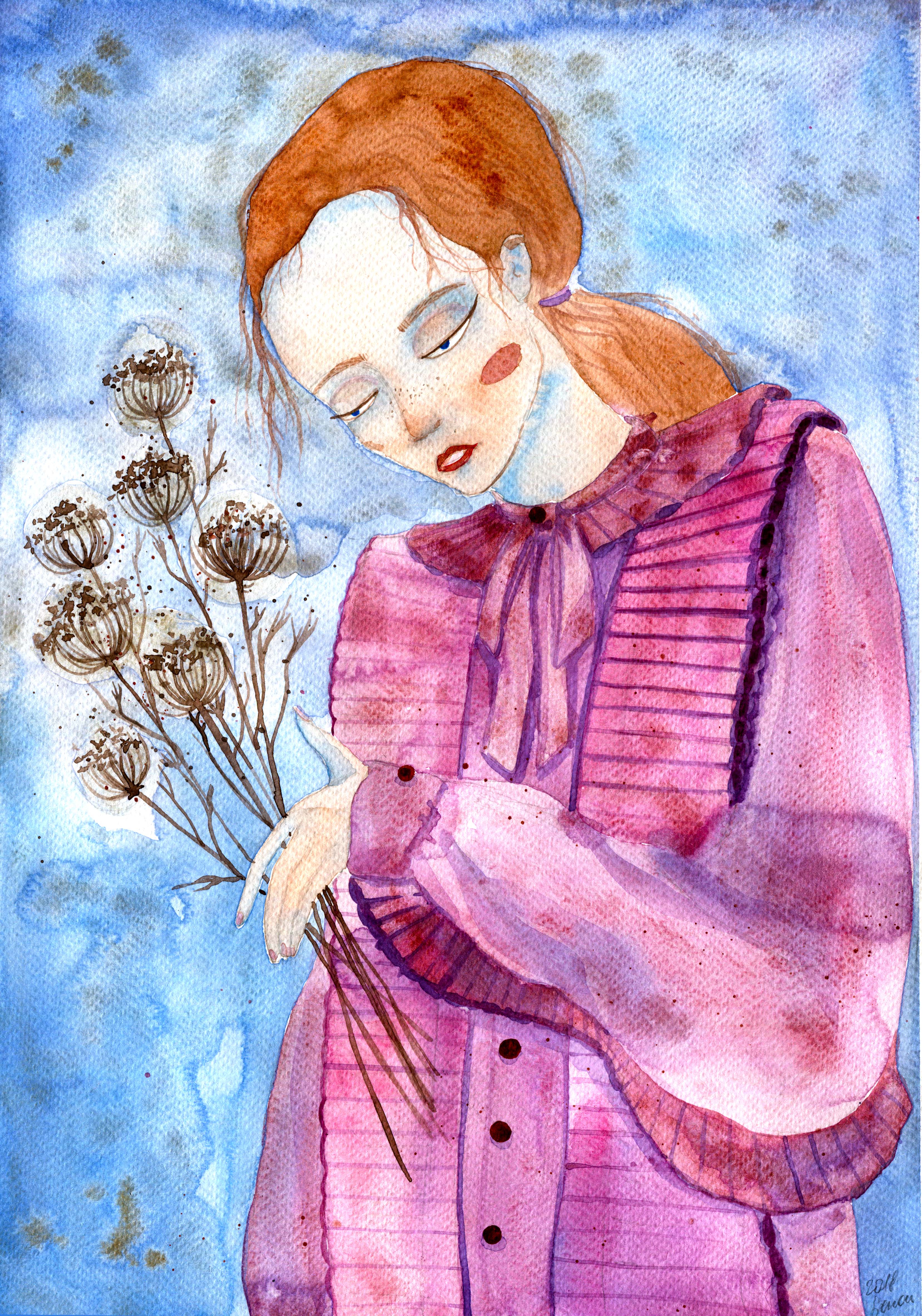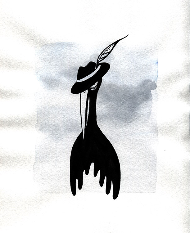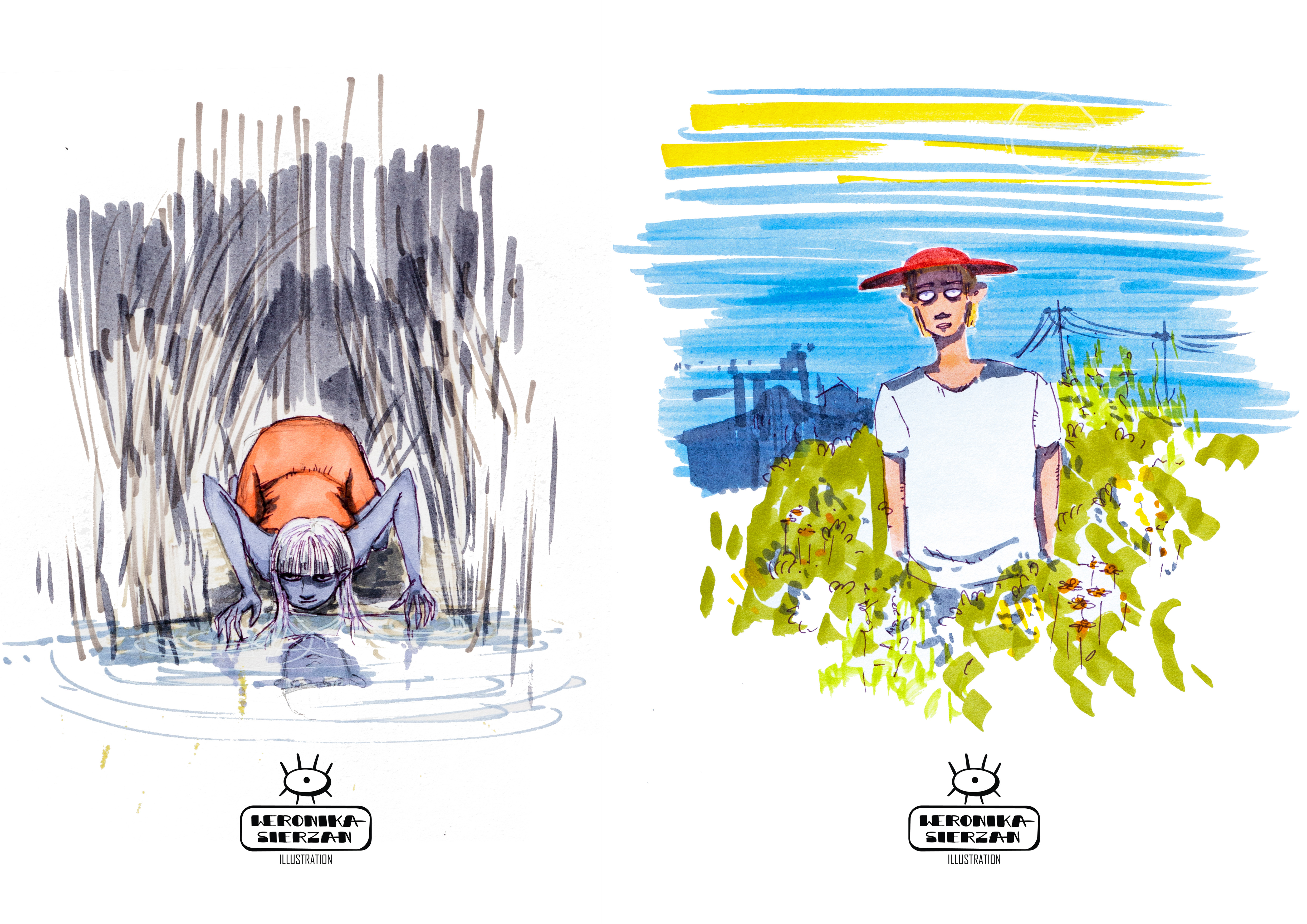 Those pictures are created by different media, but when it comes to traditional tools, I mostly use watercolors and ink. You can also find some acrylic paintings and marker drawings.