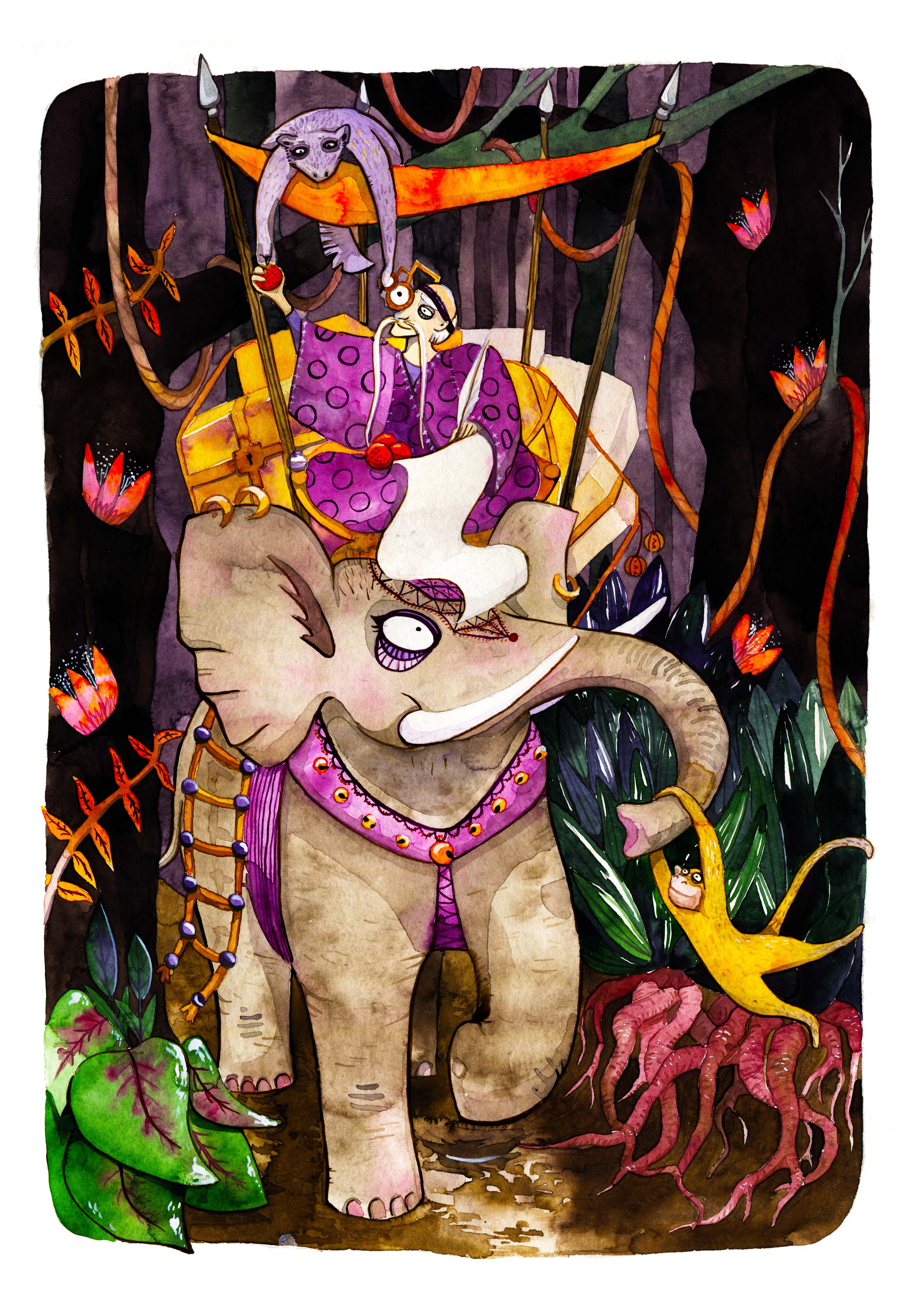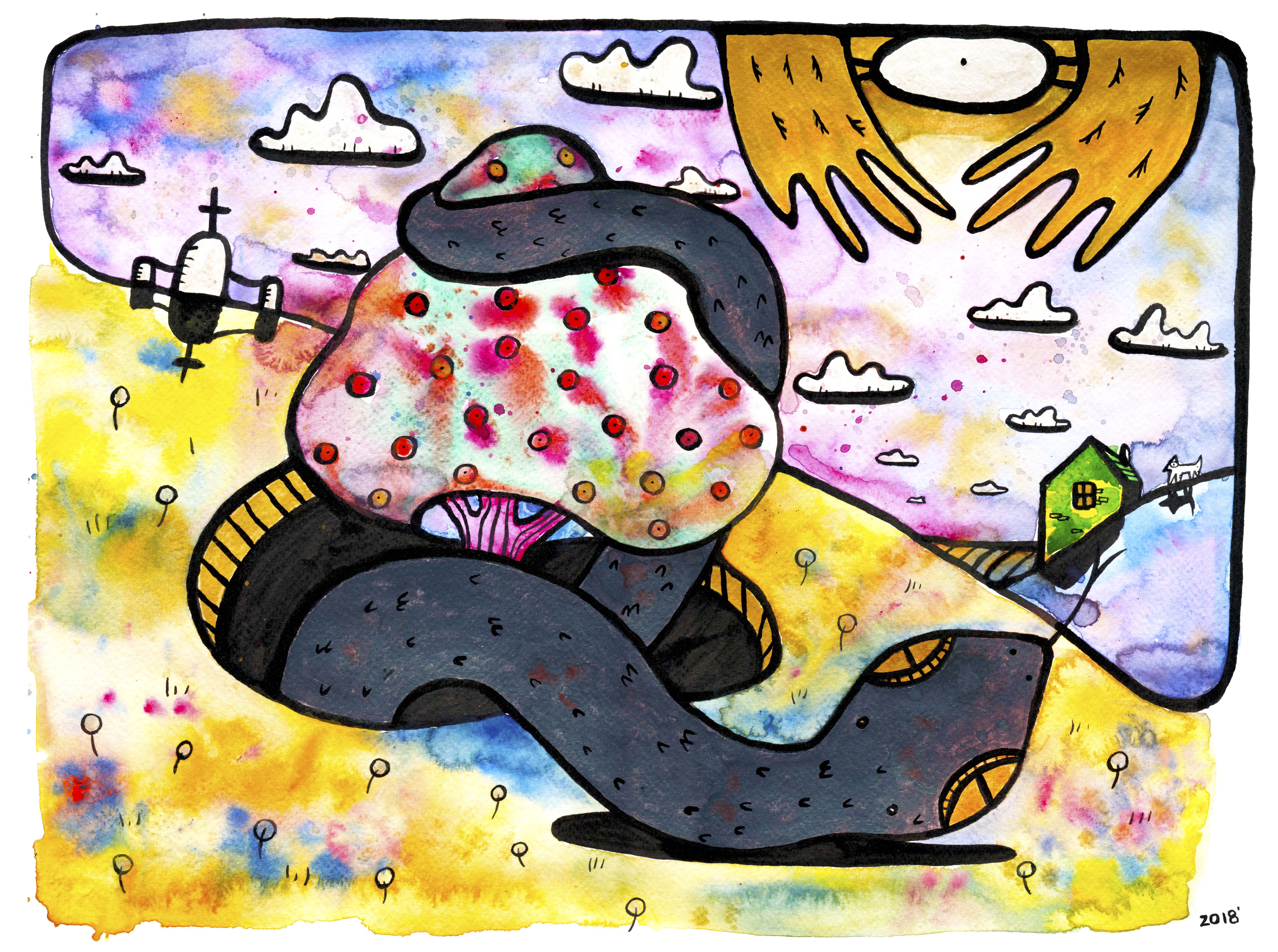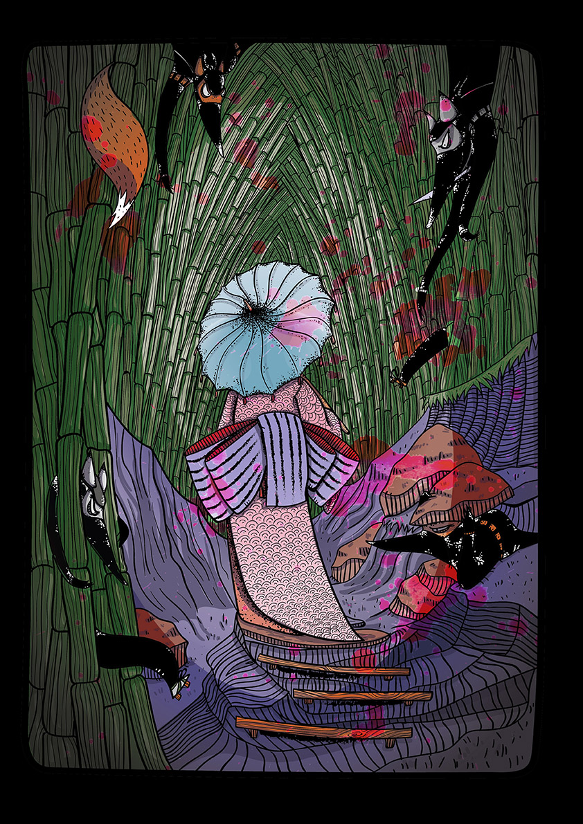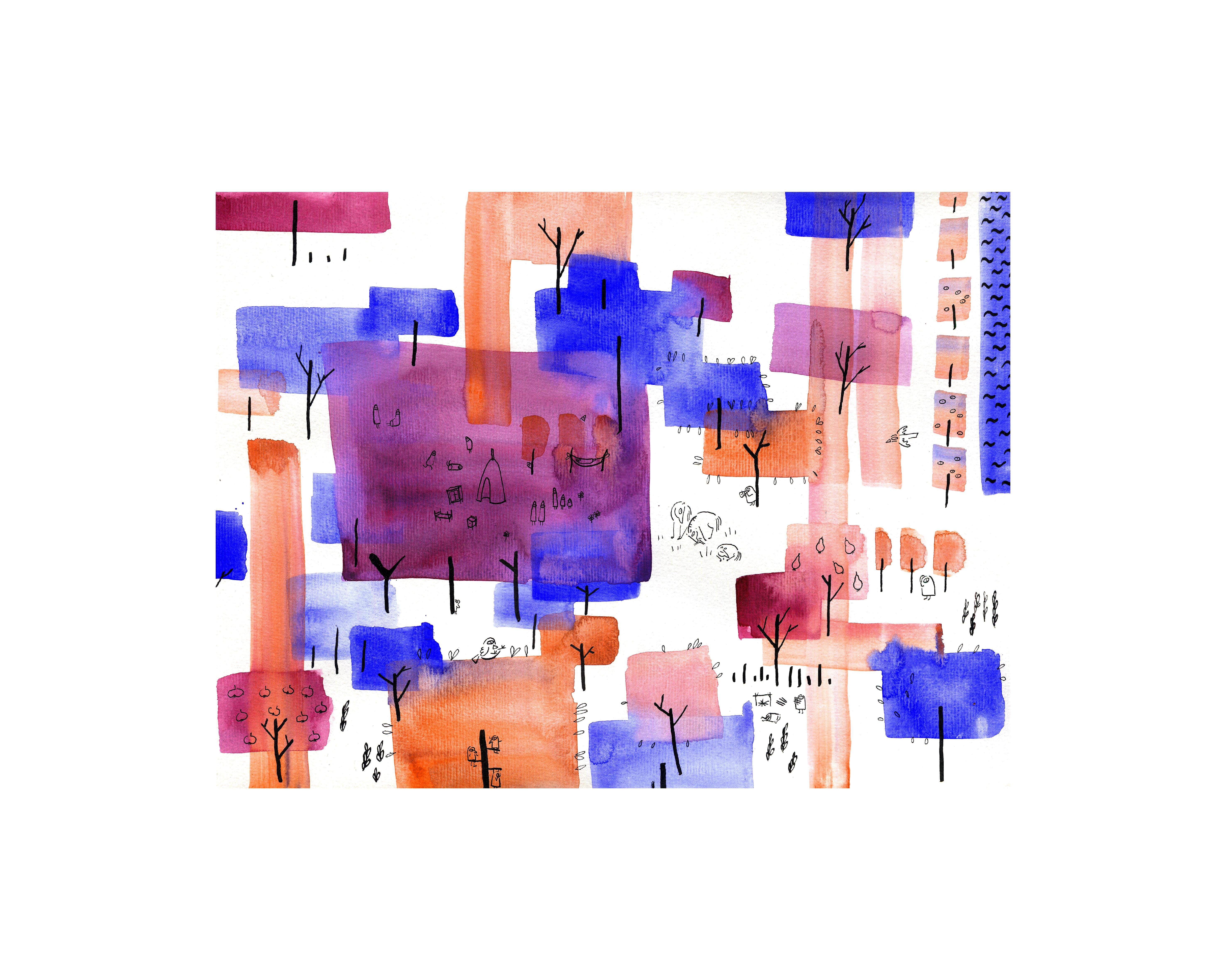 Those pictures are created by different media, but when it comes to traditional tools, I mostly use watercolors and ink. You can also find some acrylic paintings and marker drawings.
