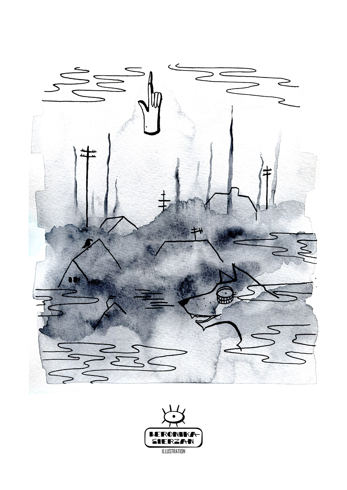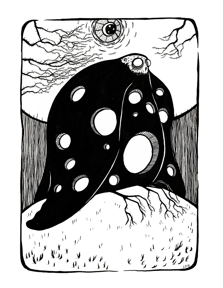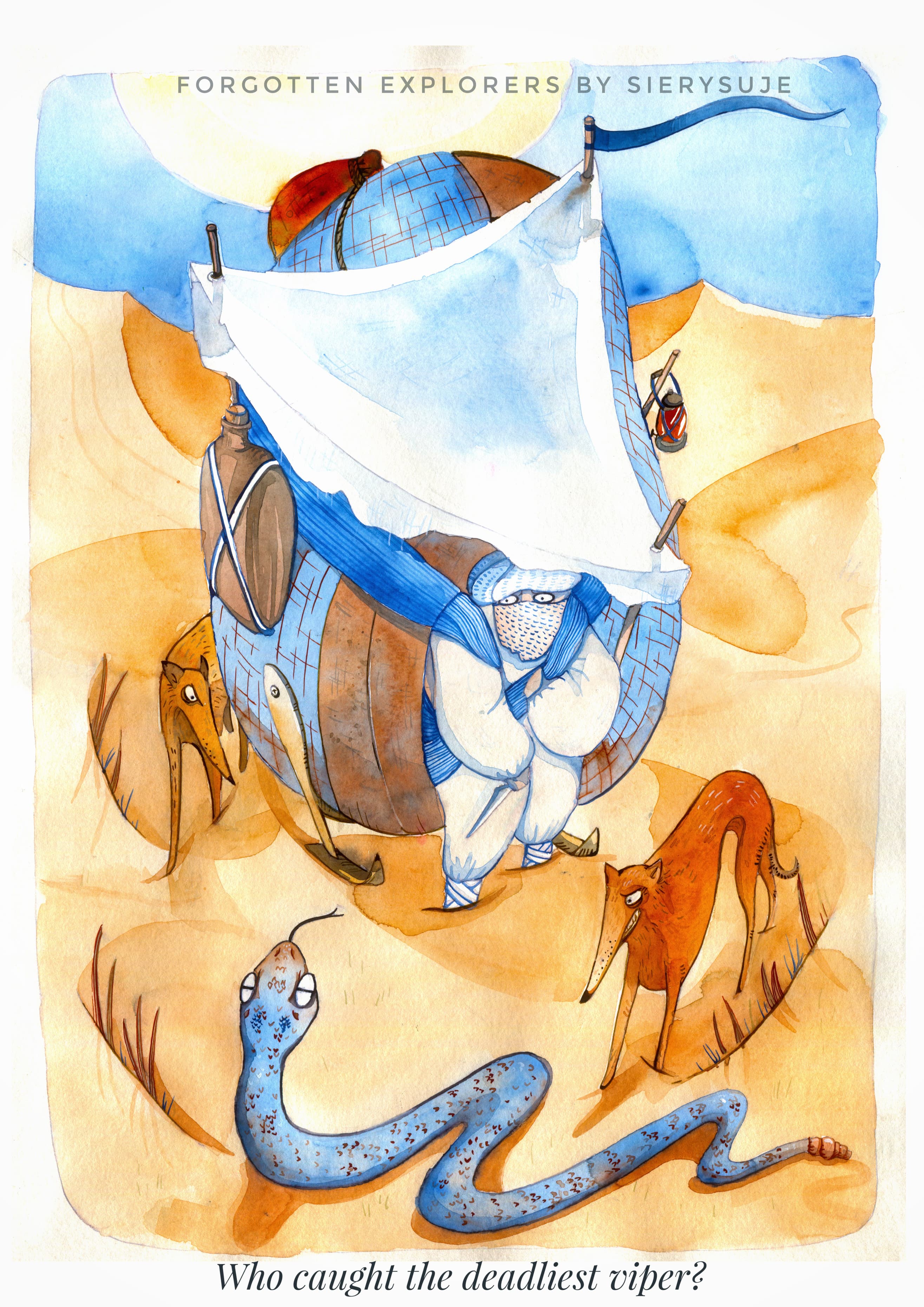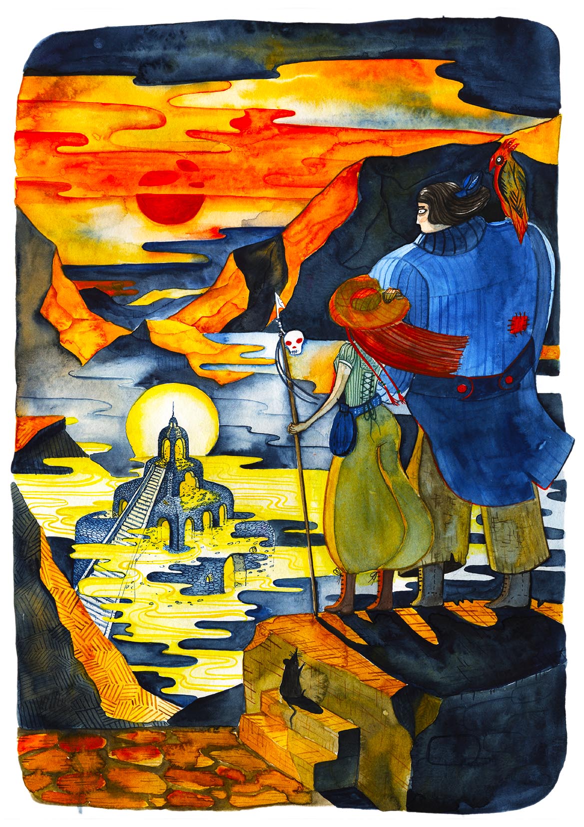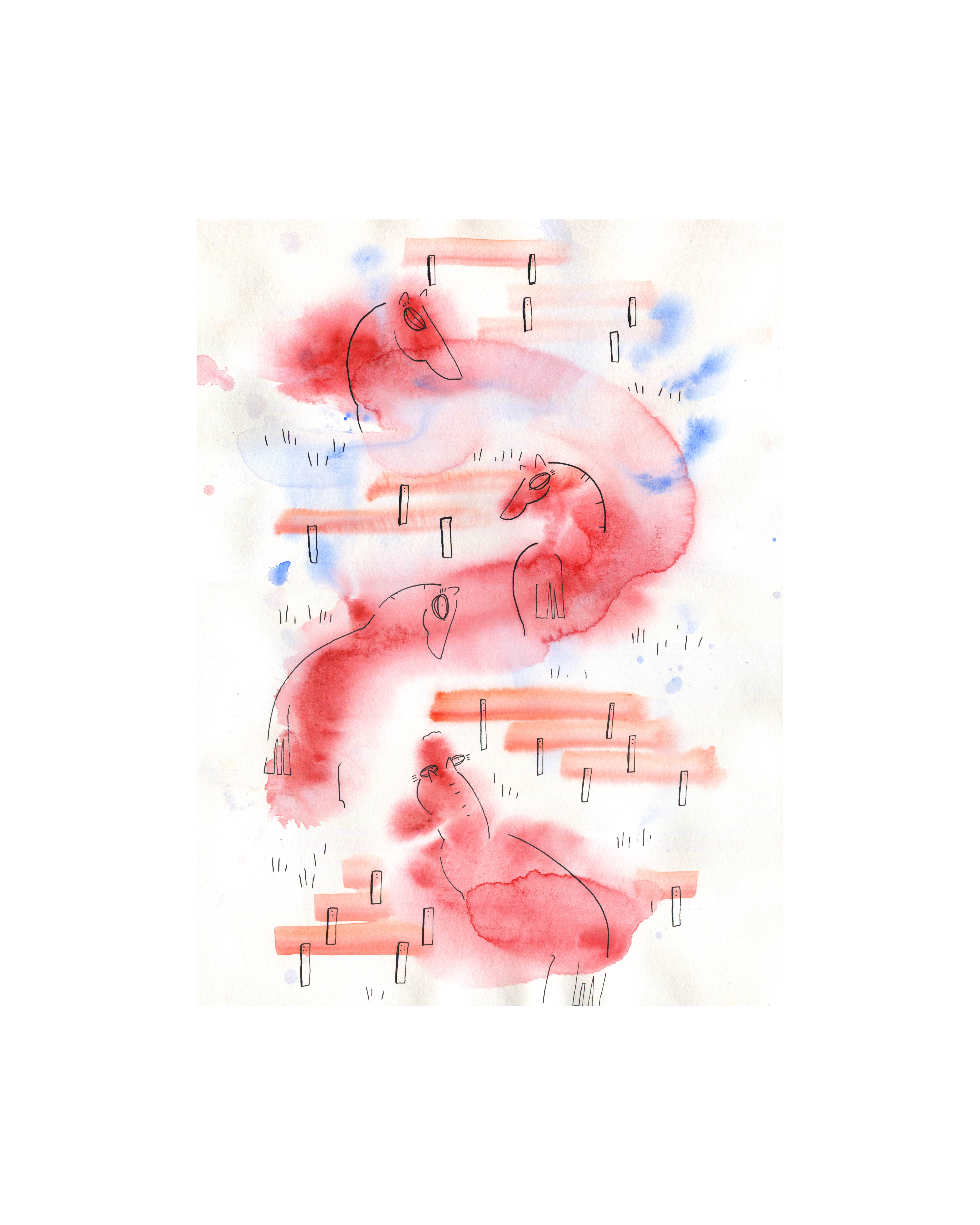 Those pictures are created by different media, but when it comes to traditional tools, I mostly use watercolors and ink. You can also find some acrylic paintings and marker drawings.